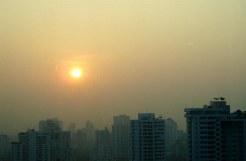 そして、最近の朝陽は、うっすらと澱んだ靄の中に「真っ赤な太陽がぼっ〜と浮かんでいます」丁度 今日本の夕陽が赤く沈んでいくように綺麗な、真っ赤な太陽です。